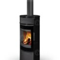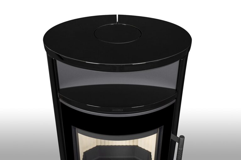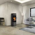 This fireplace stove is suitable for low-energy homes. The stove door includes a large glazed area with a designer print. The ventilated designer handle permits use when the stove is lit. The door can be locked in the open position. An EAI (External Air Intake) system is included. The standard version includes the option to connect an upper or rear flue gas exhaust. Thanks to the secondary air intake, the door glass is air-washed to prevent the cumulation of soot. The combustion chamber is lined with chamotte brick tiles. The primary and secondary air intakes are regulated by a single control element. The lower part of the stove includes a storage area with a door for a small amount of wood or tools.
