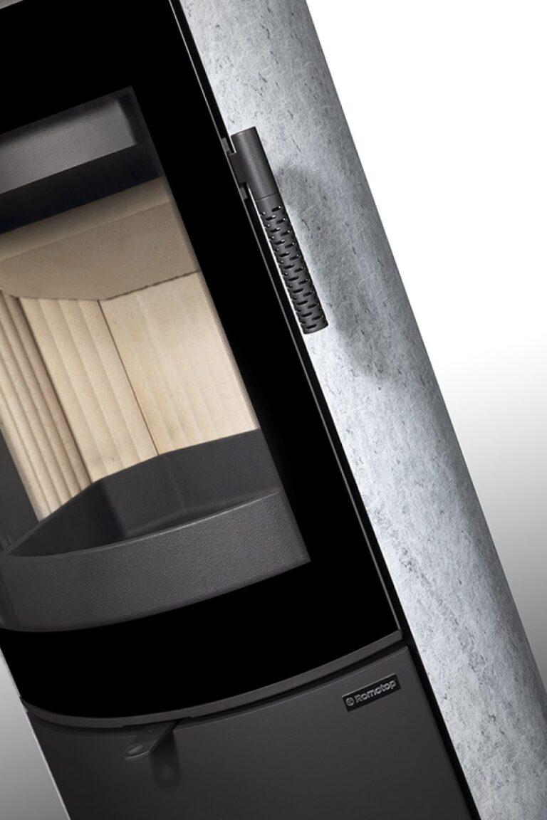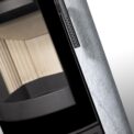 This fireplace stove is suitable for low-energy homes. The stove door includes a large glazed area with a designer print. The ventilated designer handle permits use when the stove is lit. The door can be locked in the open position. An EAI (External Air Intake) system is included. The standard version includes the option to connect an upper or rear flue gas exhaust. Thanks to the secondary air intake, the door glass is air-washed to prevent the cumulation of soot. The combustion chamber is lined with chamotte brick tiles. The primary and secondary air intakes are regulated by a single control element. The lower part of the stove includes a storage area with a door for a small amount of wood or tools.
