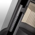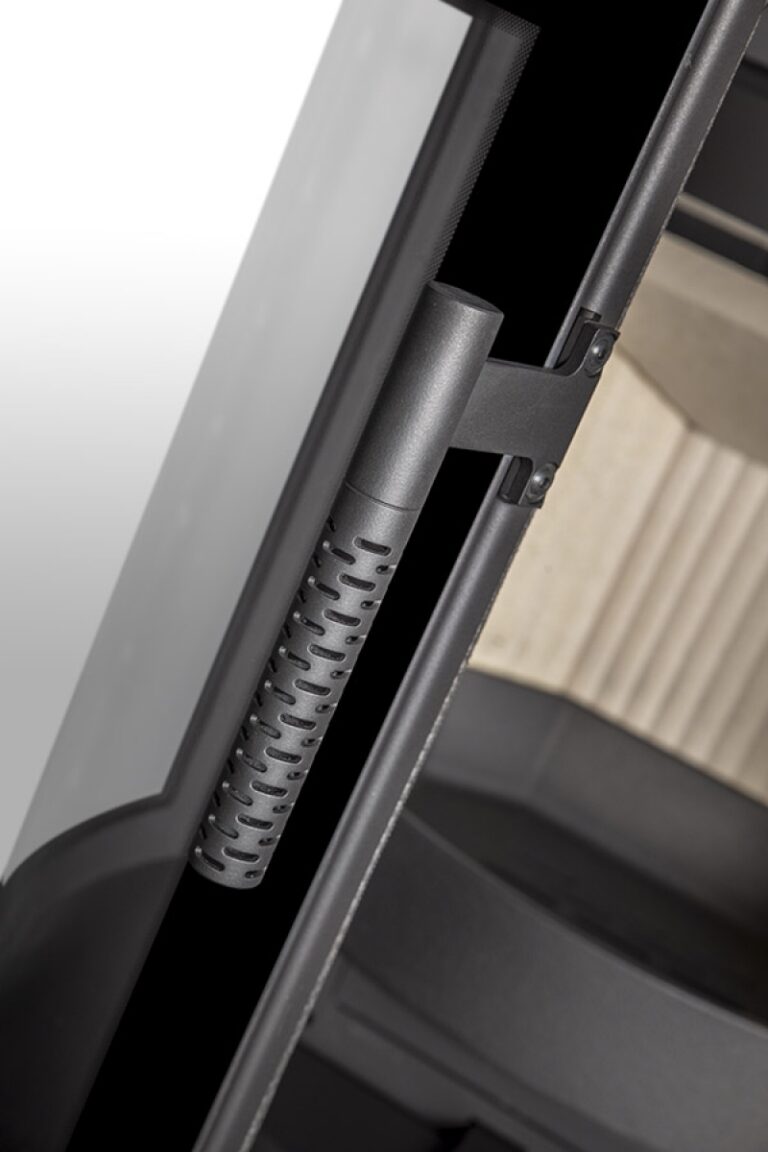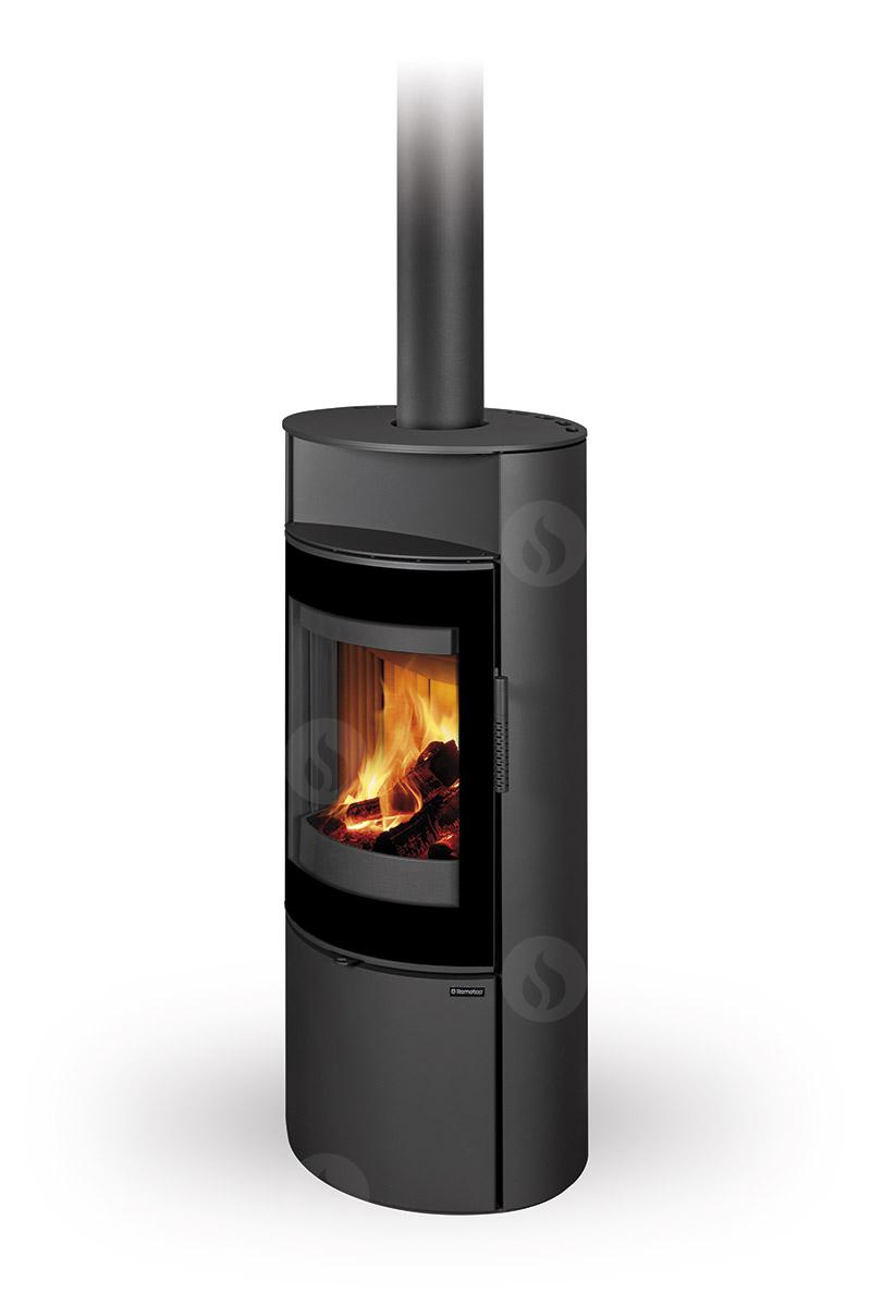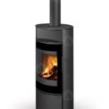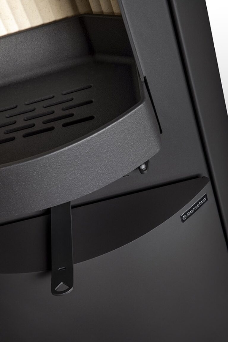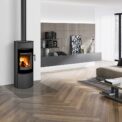 This fireplace stove is suitable for low-energy homes. The stove door includes a large glazed area with a designer print. The ventilated designer handle permits use when the stove is lit. The door can be locked in the open position. An EAI (External Air Intake) system is included. The standard version includes the option to connect an upper or rear flue gas exhaust. Thanks to the secondary air intake, the door glass is air-washed to prevent the cumulation of soot. The combustion chamber is lined with chamotte brick tiles. The primary and secondary air intakes are regulated by a single control element. The lower part of the stove includes a storage area with a door for a small amount of wood or tools.