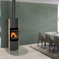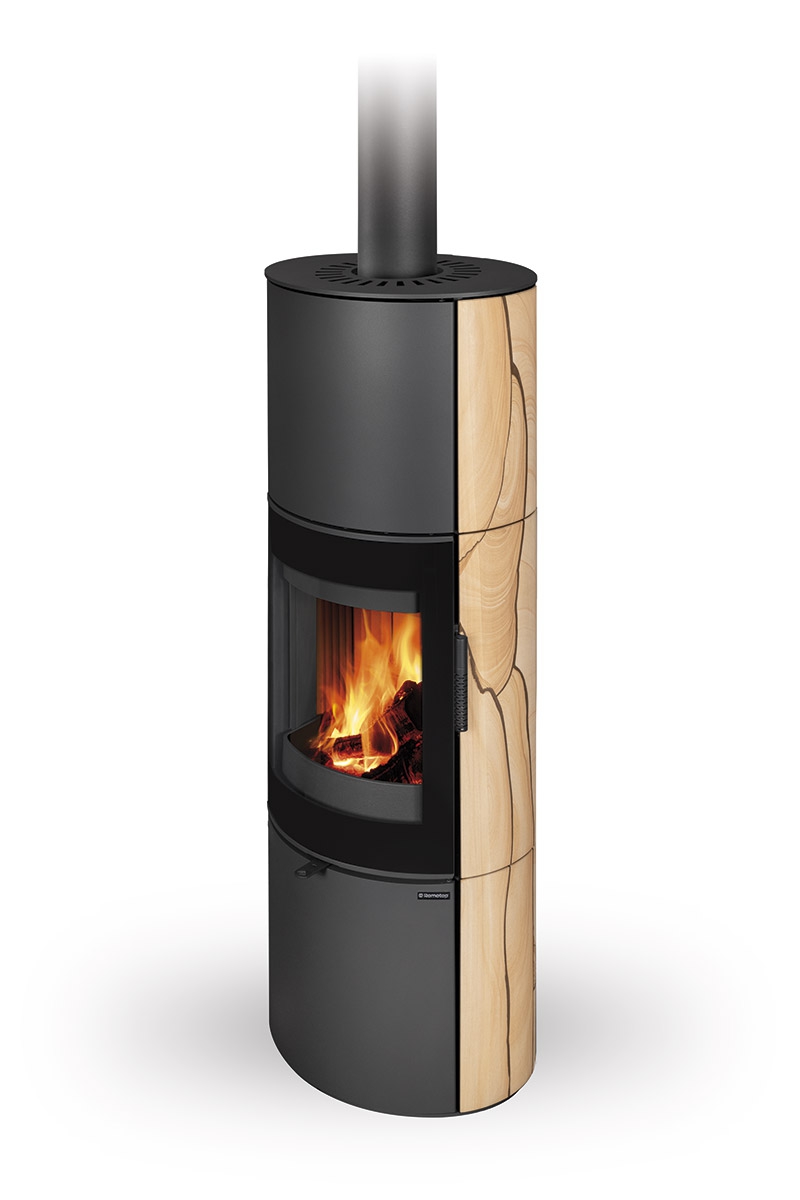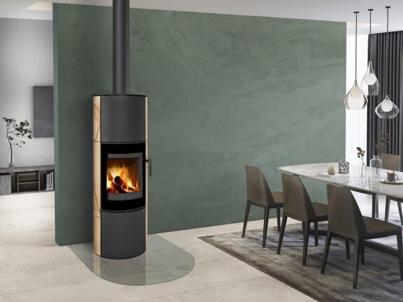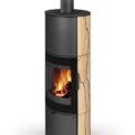 This fireplace stove is suitable for low-energy homes. The stove door includes a large glazed area with a designer print . The ventilated designer handle permits use when the stove is lit. The door can be locked in the open position. An EAI (External Air Intake) system is included. The standard version includes the option to connect an upper or rear flue gas exhaust. Thanks to the secondary air intake, the door glass is air-washed to prevent the cumulation of soot. The combustion chamber is lined with chamotte brick tiles. The primary and secondary air intakes are regulated by a single control element. The lower part of the stove includes a storage area with a door for a small amount of wood or tools. Additionally, you can purchase extra accumulation elements that radiate heat for up to 5.5 hours.