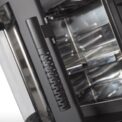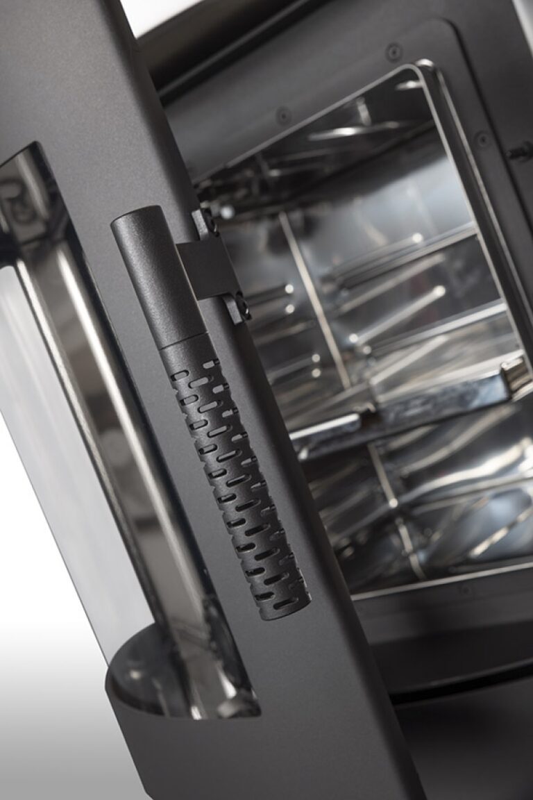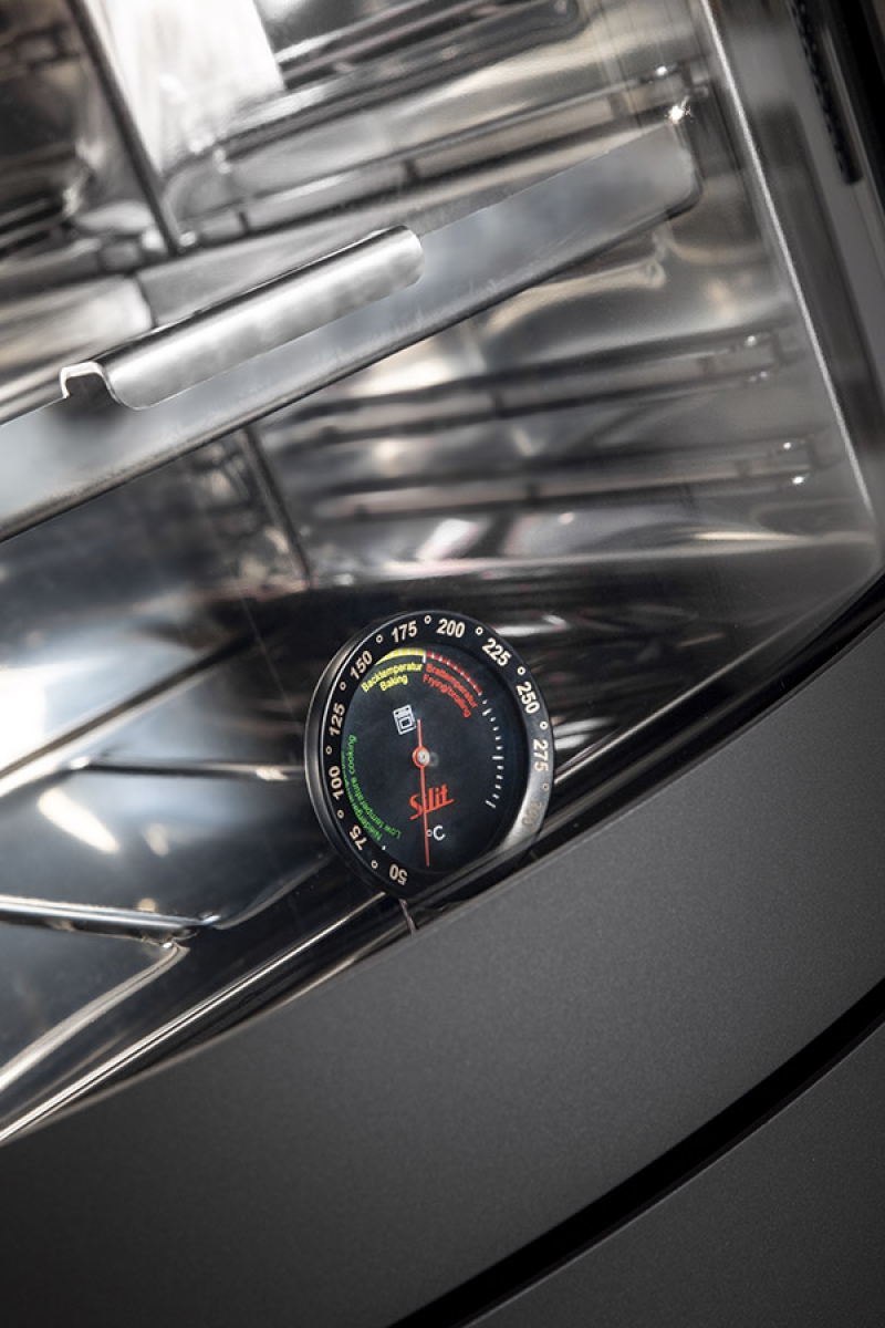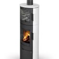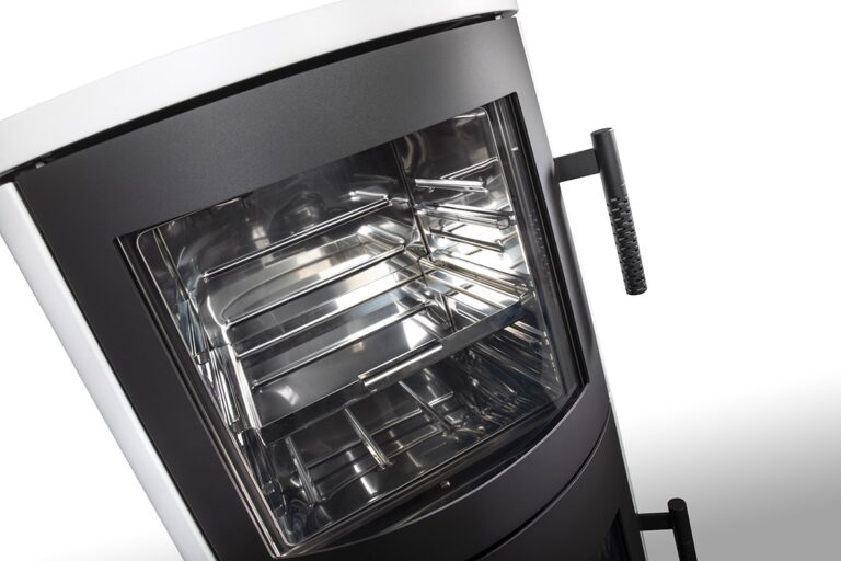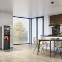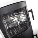 This fireplace stove is suitable for low-energy homes. The stainless oven with a high quality thermometer will always produce a perfect meal. The door can be locked in the open position. The ventilated designer handle permits use when the stove is lit. An EAI (External Air Intake) system is included. The standard version includes the option to connect an upper or rear flue gas exhaust. Thanks to the secondary air intake, the door glass is air-washed to prevent the cumulation of soot. The combustion chamber is lined with chamotte brick tiles. The primary and secondary air intakes are regulated by a single control element. The lower part of the stove includes a storage area with a door for storing a small amount of wood or tools.