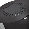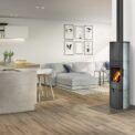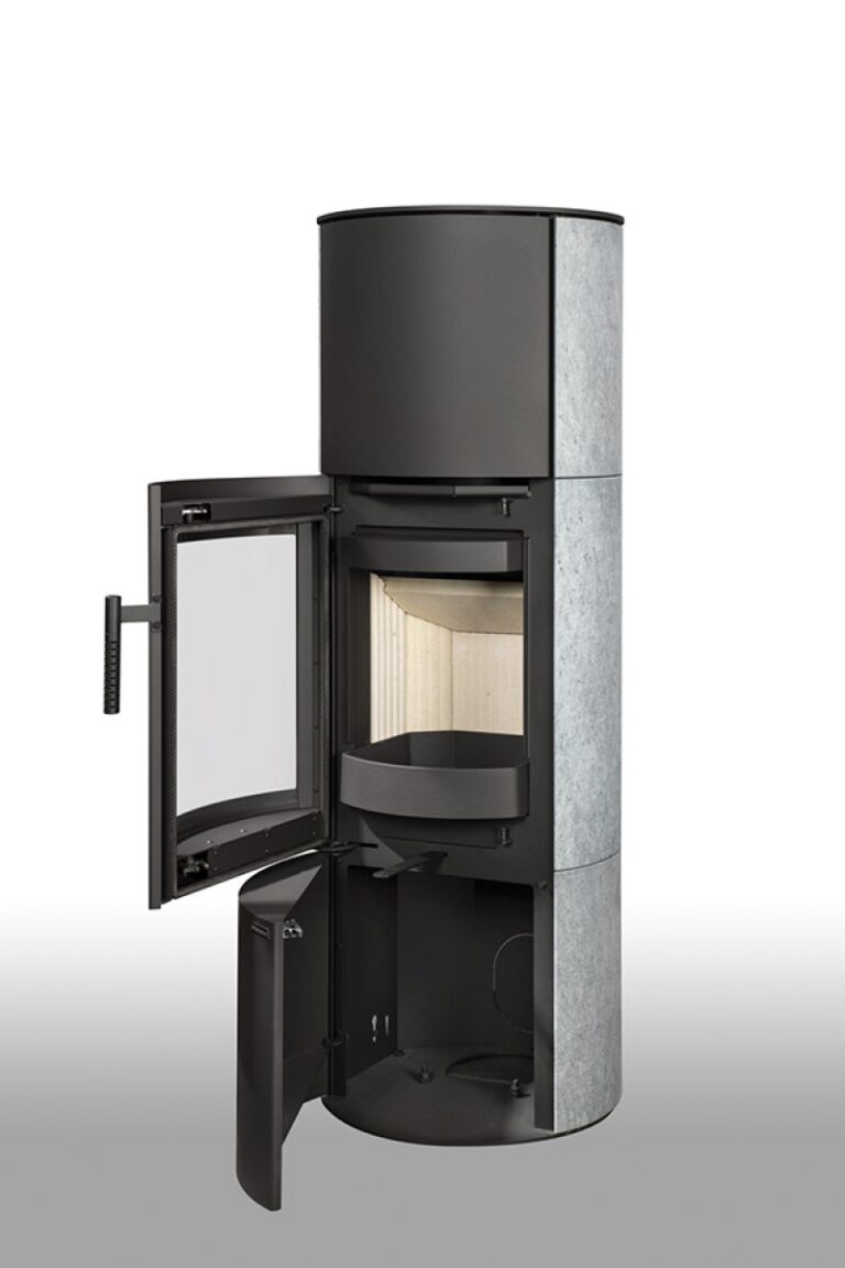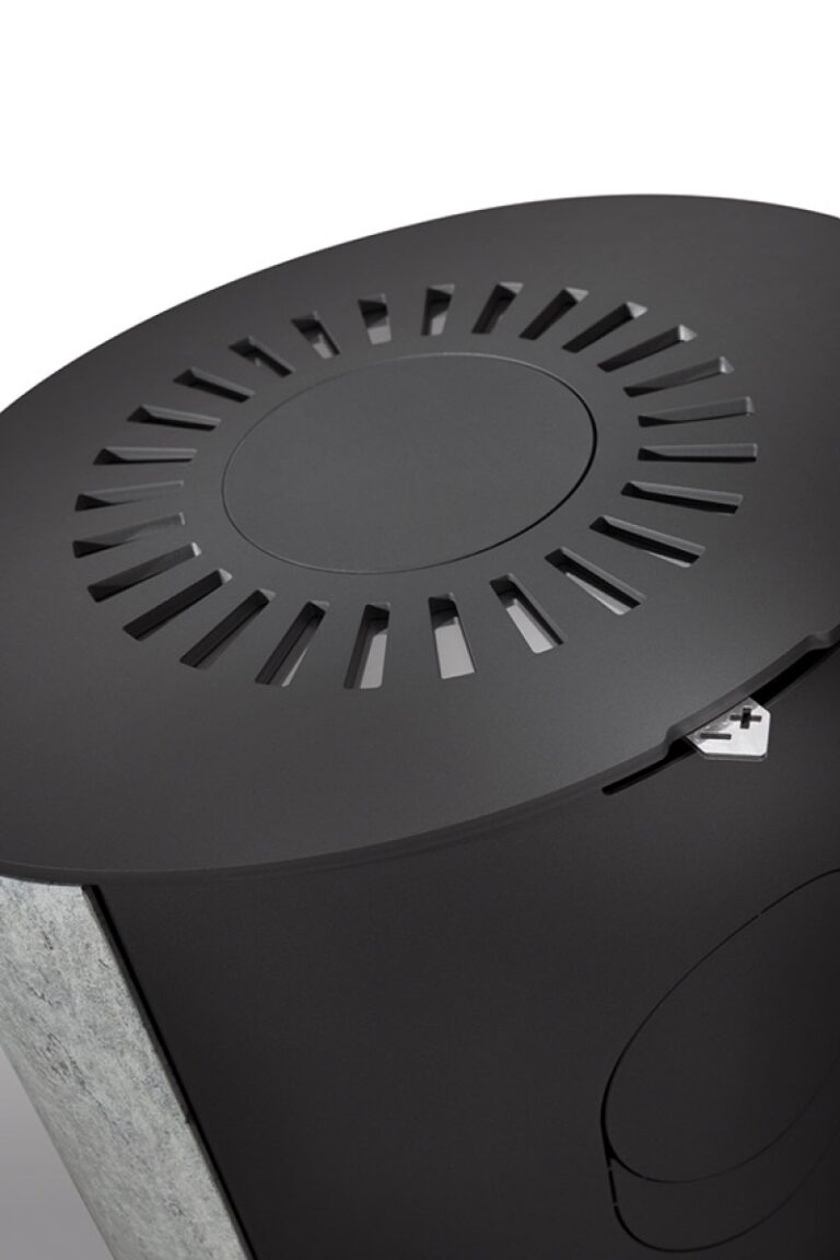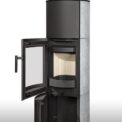 This fireplace stove is suitable for low-energy homes. An EAI (External Air Intake) system is included. The ventilated designer handle permits use when the stove is lit. The door can be locked in the open position. The standard version includes the option to connect an upper or rear flue gas exhaust. Thanks to the secondary air intake, the door glass is air-washed to prevent the cumulation of soot. The combustion chamber is lined with chamotte brick tiles. The primary and secondary air intakes are regulated by a single control element. The lower part of the stove includes a storage area with a door for storing a small amount of wood or tools. Additionally, you can purchase extra accumulation elements that radiate heat for up to 5.5 hours.