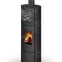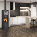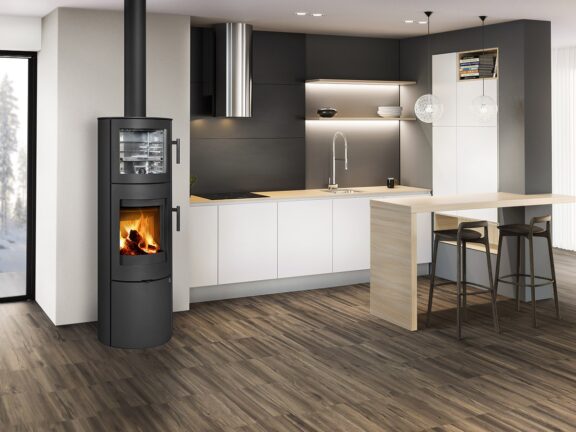 This fireplace stove is suitable for low-energy homes. The stainless oven with a high quality thermometer will always produce a perfect meal. The door can be locked in the open position. The ventilated designer handle permits use when the stove is lit. An EAI (External Air Intake) system is included. The standard version includes the option to connect an upper or rear flue gas exhaust. Thanks to the secondary air intake, the door glass is air-washed to prevent the cumulation of soot. The combustion chamber is lined with chamotte brick tiles. The primary and secondary air intakes are regulated by a single control element. The lower part of the stove includes a storage area with a door for storing a small amount of wood or tools.