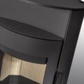 This fireplace stove is suitable for low-energy homes. An EAI (External Air Intake) system is included. The ventilated designer handle permits use when the stove is lit. The door can be locked in the open position. The standard version includes the option to connect an upper or rear flue gas exhaust. Thanks to the secondary air intake, the door glass is air-washed to prevent the cumulation of soot. The combustion chamber is lined with chamotte brick tiles. The primary and secondary air intakes are regulated by a single control element. The lower part of the stove includes a storage area with a door for storing a small amount of wood or tools.