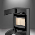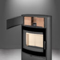 The NAVIA G H fireplace stove is suitable for low-energy homes. An EAI (External Air Intake) system is included. The standard version includes the option to connect an upper or rear flue gas exhaust. Thanks to the secondary air intake, the door glass is air-washed to prevent the cumulation of soot. The combustion chamber is lined with chamotte brick tiles. The primary and secondary air intakes are regulated by a single control element. The lower part of the stove includes a storage area with a door for storing a small amount of wood or tools. The unit can be fitted with heat accumulation fittings, thus extending the time of heat radiation after the flame has extinguished.