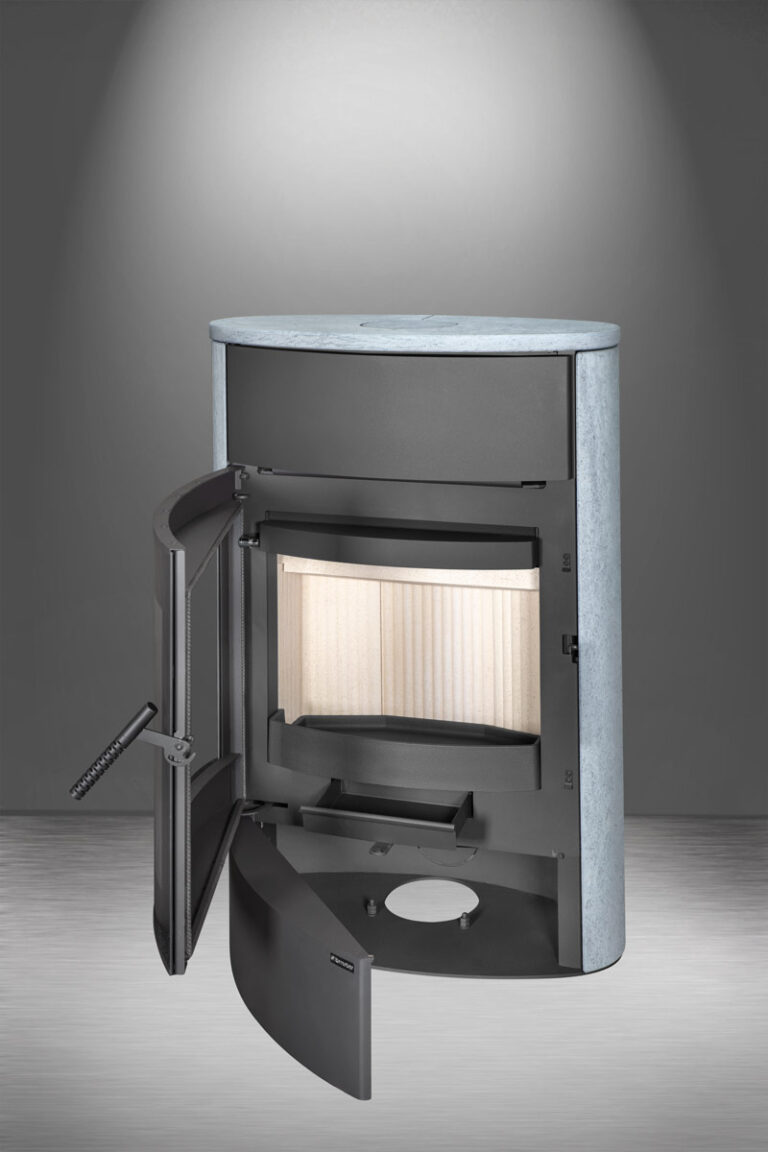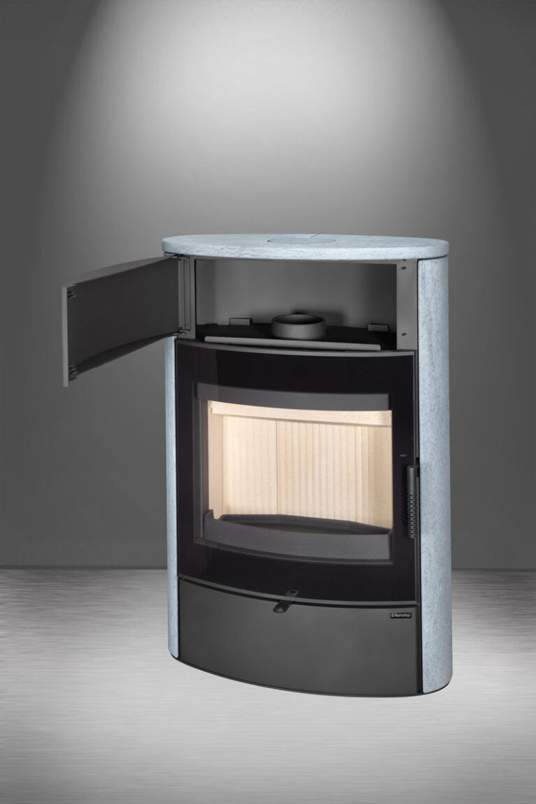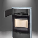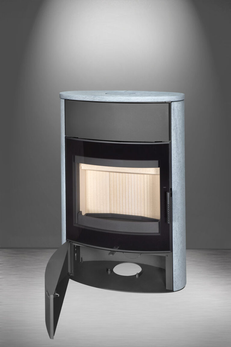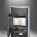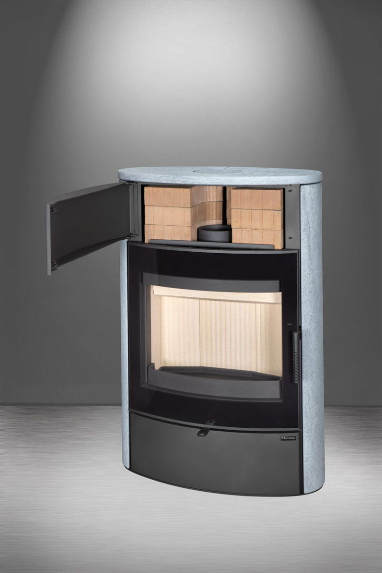 The NAVIA G H fireplace stove is suitable for low-energy homes. An EAI (External Air Intake) system is included. The standard version includes the option to connect an upper or rear flue gas exhaust. Thanks to the secondary air intake, the door glass is air-washed to prevent the cumulation of soot. The combustion chamber is lined with chamotte brick tiles. The primary and secondary air intakes are regulated by a single control element. The lower part of the stove includes a storage area with a door for storing a small amount of wood or tools. The unit can be fitted with heat accumulation fittings, thus extending the time of heat radiation after the flame has extinguished.