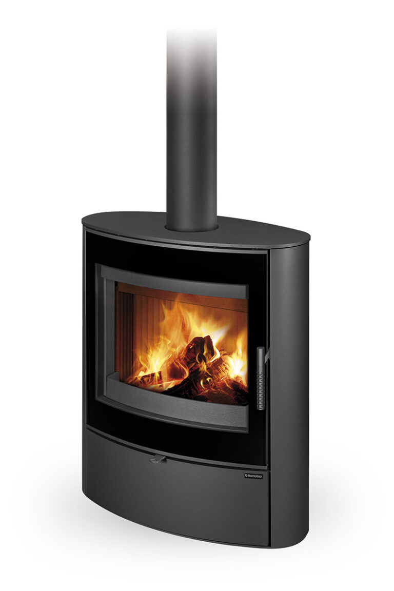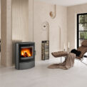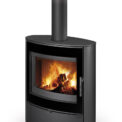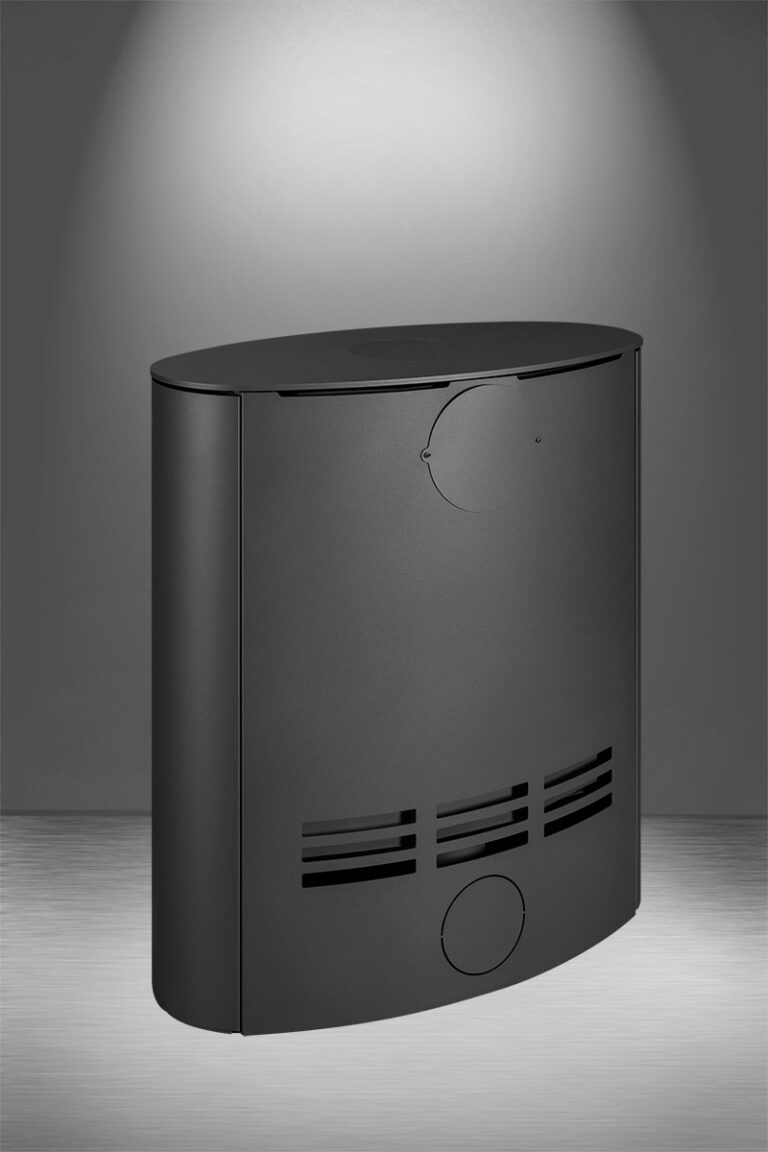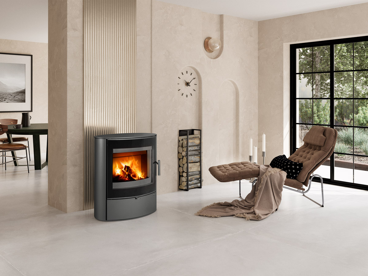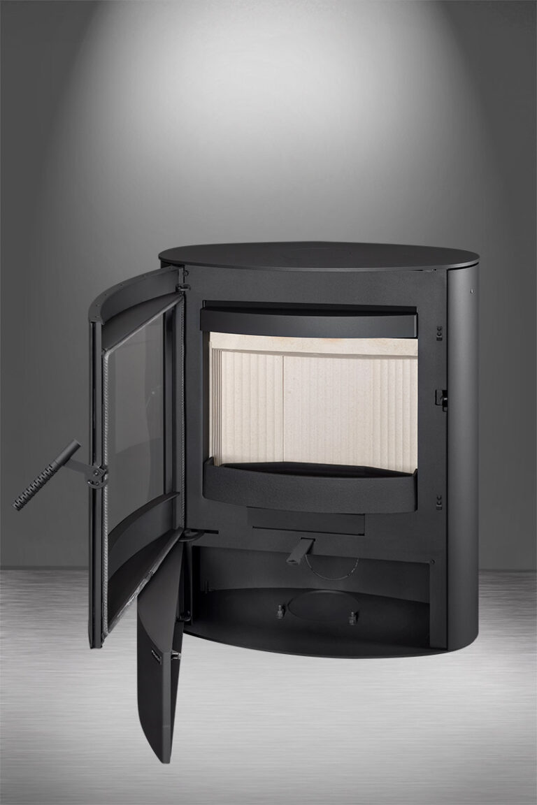 The specialised black heat-resistant glass print not only adds more style to the stove, but also enhances the visual impression of the burning flame and becomes the centrepiece of any room. This attractive feature is perfectly combined with the high functionality the stove offers. The three-point door closure ensures perfect sealing and efficient combustion, while the integrated wood door contributes to aesthetics and practicality. The stove has a generous firebox that accepts logs up to 50 cm in length, maximising burn time and simplifying fuel handling. The commitment to ecology is evident in compliance with ECODESIGN regulations, which make the stove stand out for its low emissions and safe combustion.