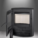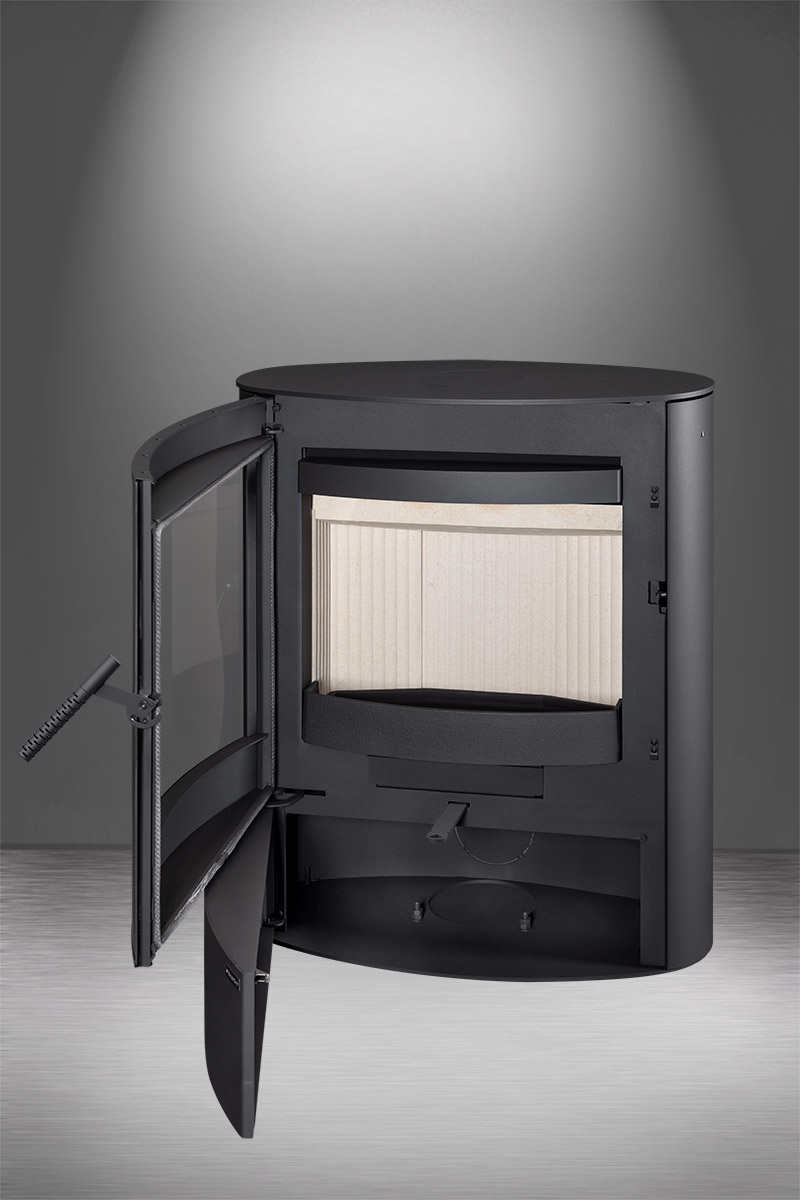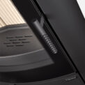 This fireplace stove is suitable for low-energy homes. The stove door includes a large glazed area with a designer print. An EAI (External Air Intake) system is included. Designer control elements made of polished metal. The door can be locked in the open position. The standard version includes the option to connect an upper or rear flue gas exhaust. Thanks to the secondary air intake, the door glass is air-washed to prevent the cumulation of soot. The combustion chamber is lined with chamotte brick tiles. The primary and secondary air intakes are regulated by a single control element.