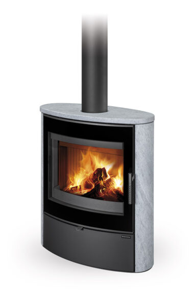 This fireplace stove is suitable for low-energy homes. The stove door includes a large glazed area with a designer print. An EAI (External Air Intake) system is included. Designer control elements made of polished metal. The door can be locked in the open position. The standard version includes the option to connect an upper or rear flue gas exhaust. Thanks to the secondary air intake, the door glass is air-washed to prevent the cumulation of soot. The combustion chamber is lined with chamotte brick tiles. The primary and secondary air intakes are regulated by a single control element.