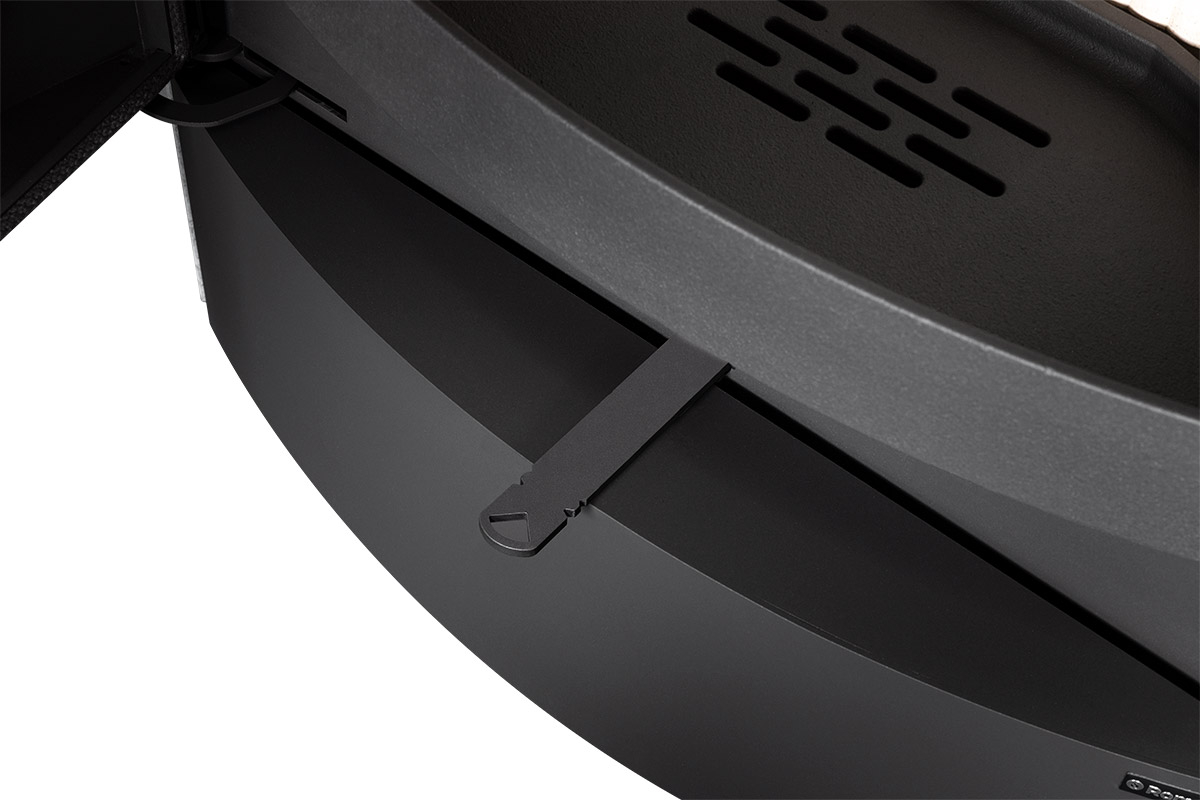 This fireplace stove is suitable for low-energy homes. An EAI (External Air Intake) system is included. The standard version includes the option to connect an upper or rear flue gas exhaust. Thanks to the secondary air intake, the door glass is air-washed to prevent the cumulation of soot. The combustion chamber is lined with chamotte brick tiles. The primary and secondary air intakes are regulated by a single control element. The lower part of the stove includes a storage area with a door for storing a small amount of wood or tools.