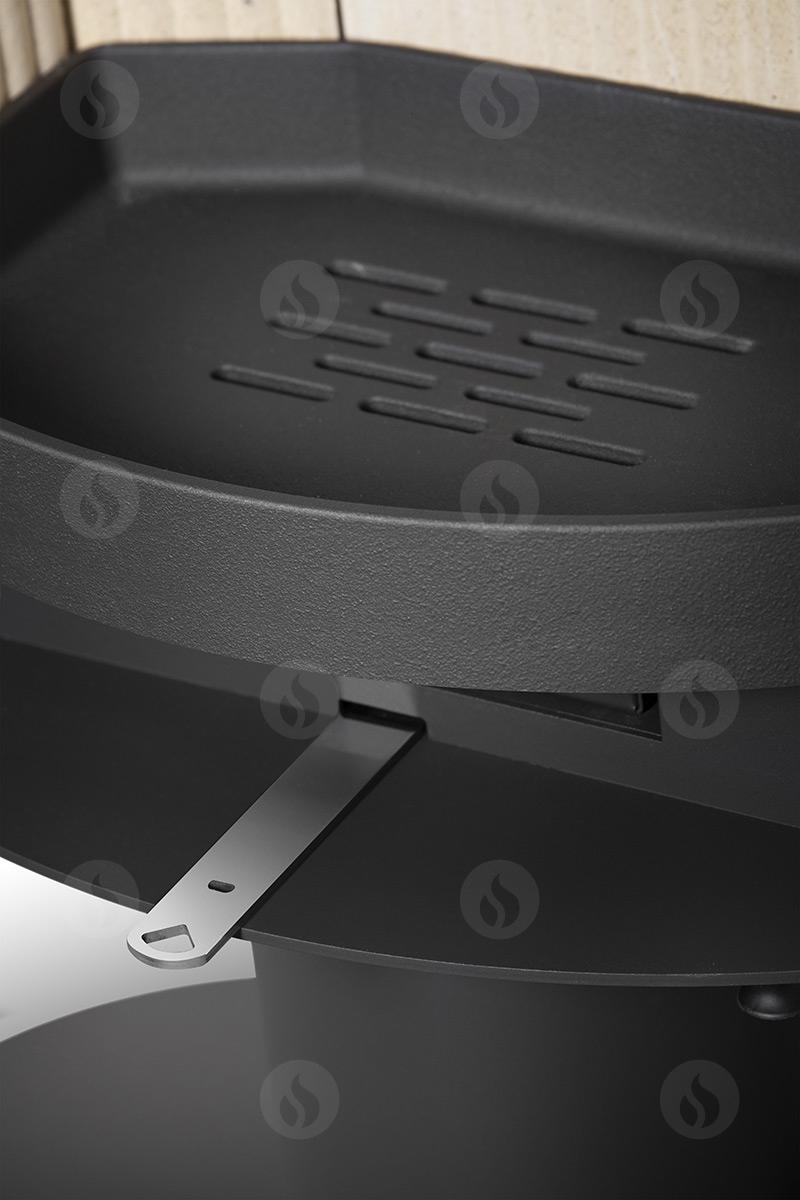 This fireplace stove is suitable for low-energy homes. The designer stainless steel ventilated handle permits use when the stove is lit. Its special stand allows the combustion chamber to rotate. An EAI (External Air Intake) system is included. The standard version has an upper flue gas exhaust. Thanks to the secondary air intake, the door glass is air-washed to prevent the cumulation of soot. The combustion chamber is lined with chamotte brick tiles. The primary and secondary air intakes are regulated by a single control element.