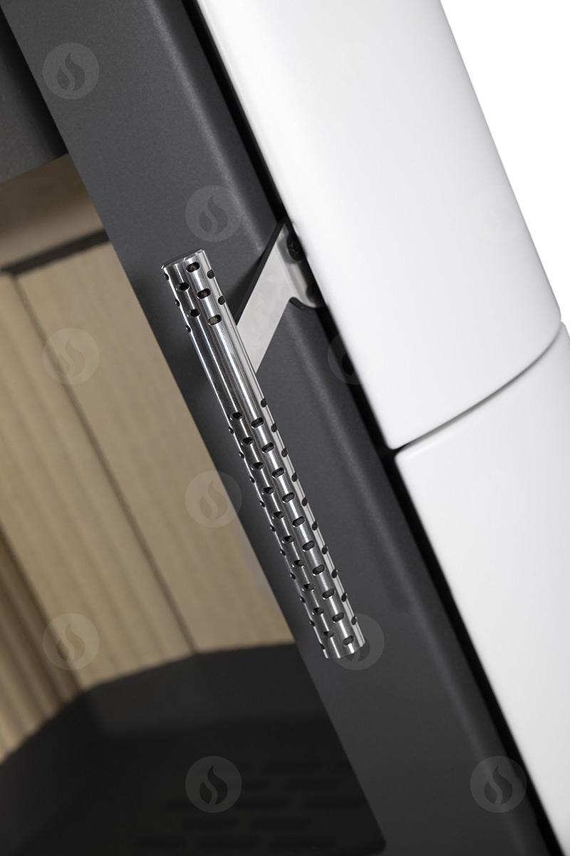 This fireplace stove is suitable for low-energy homes. The designer stainless steel ventilated handle permits use when the stove is lit. Its special stand allows the combustion chamber to rotate. An EAI (External Air Intake) system is included. The standard version has an upper flue gas exhaust. Thanks to the secondary air intake, the door glass is air-washed to prevent the cumulation of soot. The combustion chamber is lined with chamotte brick tiles. The primary and secondary air intakes are regulated by a single control element.