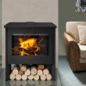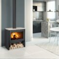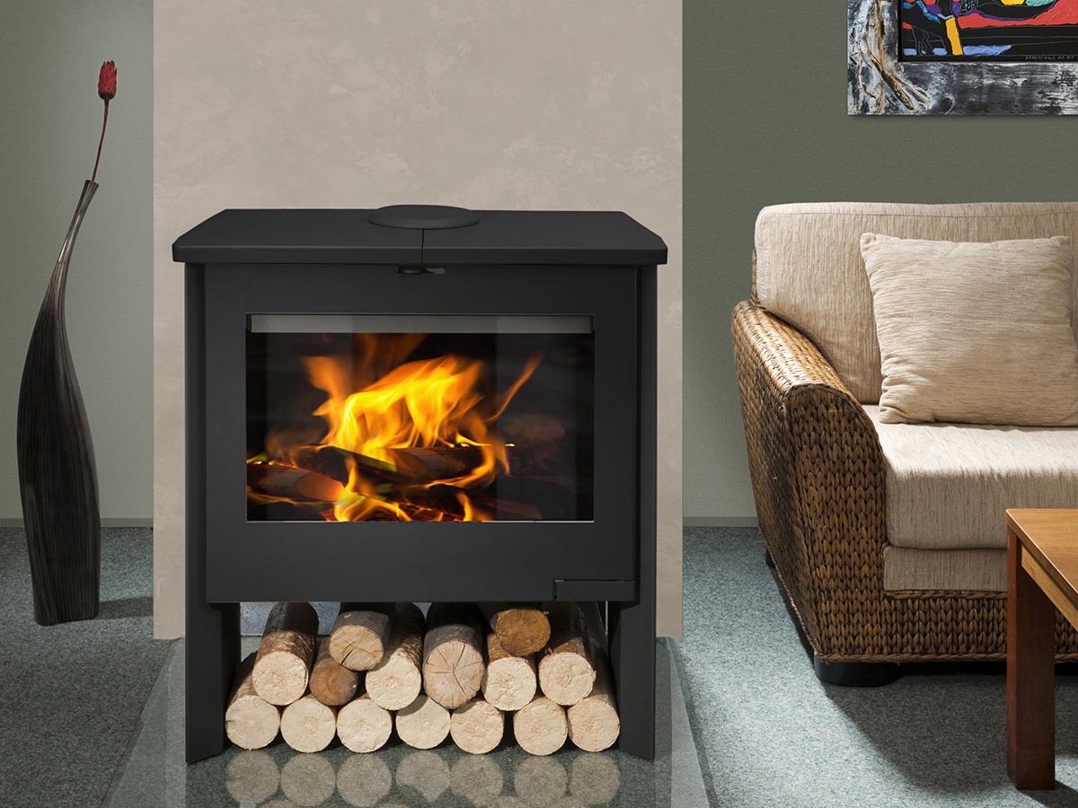 This fireplace stove is suitable for various types of interiors. The standard version includes the option to connect an upper or rear flue gas exhaust. Thanks to the secondary air intake, the door glass is air-washed to prevent the cumulation of soot. The combustion chamber is lined with chamotte brick tiles. The primary and secondary air intakes are regulated by a single control element. The bottom part of the stove can be used for storing a small amount of wood.