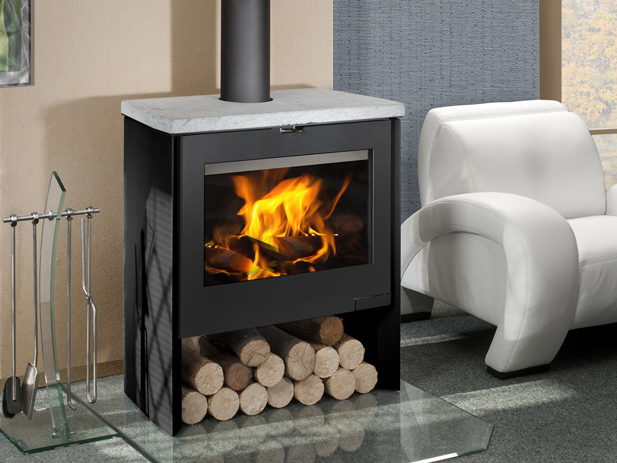 This fireplace stove is suitable for various types of interiors. The standard version includes the option to connect an upper or rear flue gas exhaust. Thanks to the secondary air intake, the door glass is air-washed to prevent the cumulation of soot. The combustion chamber is lined with chamotte brick tiles. The primary and secondary air intakes are regulated by a single control element. The bottom part of the stove can be used for storing a small amount of wood.