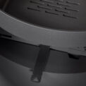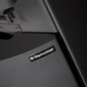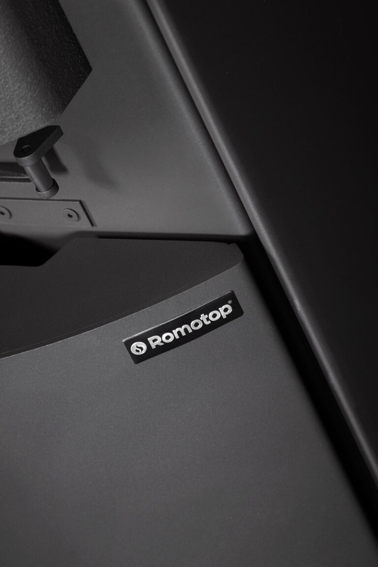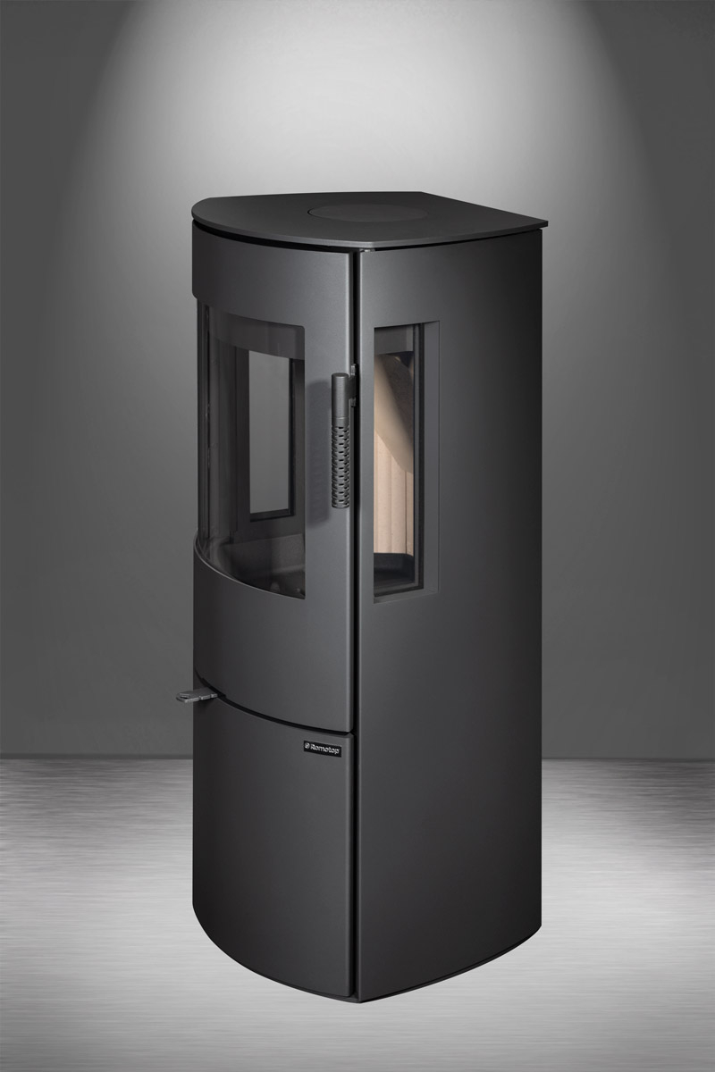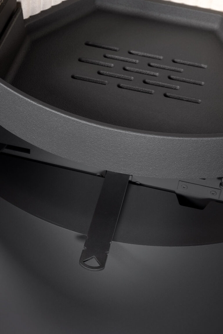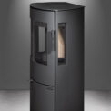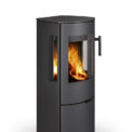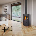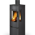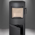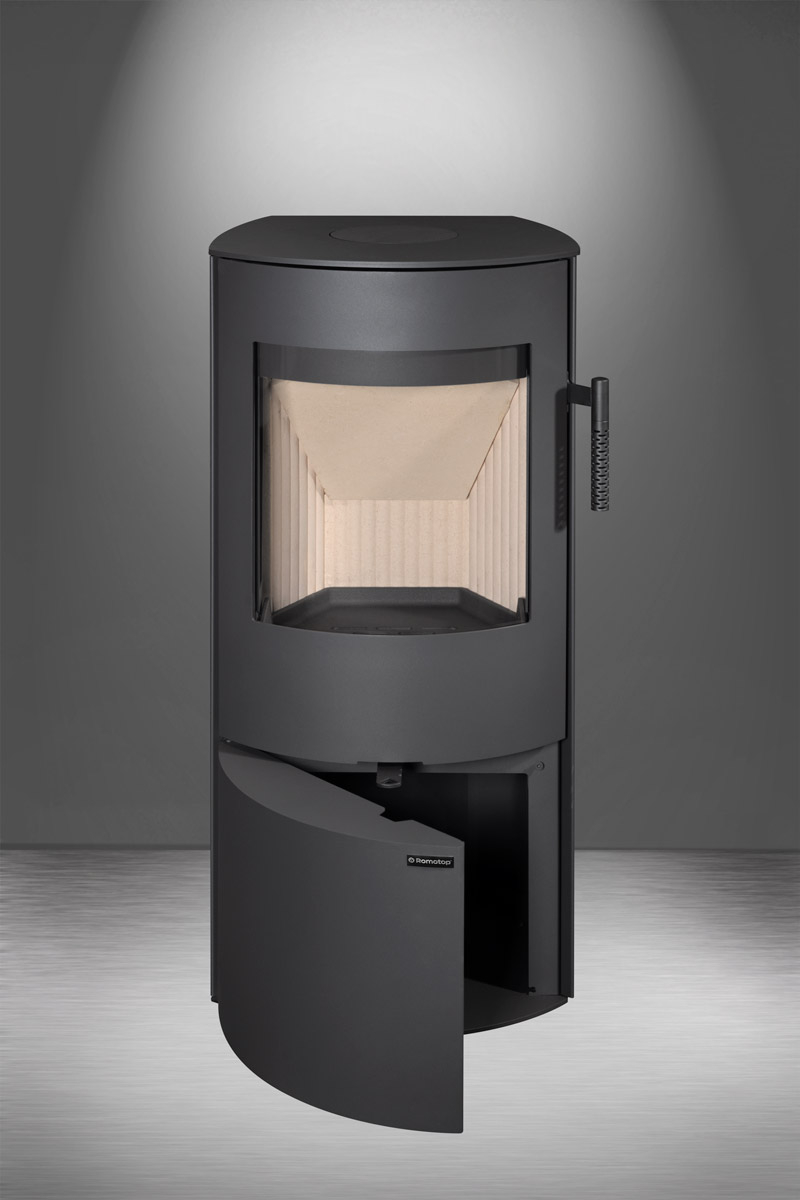 This fireplace stove is suitable for low-energy homes. An EAI (External Air Intake) system is included. The standard version includes the option to connect an upper or rear flue gas exhaust. Thanks to the secondary air intake, the door glass is air-washed to prevent the cumulation of soot. The combustion chamber is lined with chamotte brick tiles. The primary and secondary air intakes are regulated by a single control element. The lower part of the stove includes a storage area with a door for storing a small amount of wood or tools.