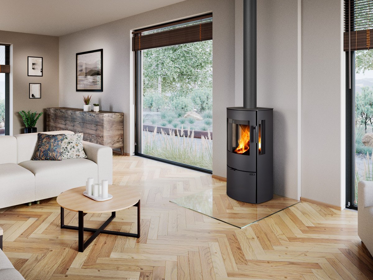 The basic SEIDO 3S model is characterised by its minimalist yet elegant design. The combination of three-sided glazing with a modern combustion chamber allows not only a clean burn, but also a fascinating view of the flames from anywhere in the room. This model is ideal for those looking for quality and functionality in a simple design. Natural serpentine stone, ceramic tile or black durable sheet metal are available as cladding.