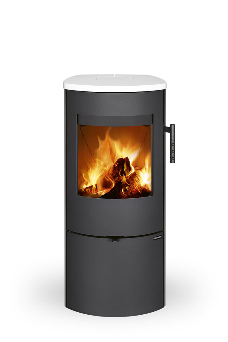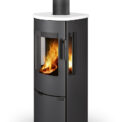 This fireplace stove is suitable for low-energy homes. An EAI (External Air Intake) system is included. The standard version includes the option to connect an upper or rear flue gas exhaust. Thanks to the secondary air intake, the door glass is air-washed to prevent the cumulation of soot. The combustion chamber is lined with chamotte brick tiles. The primary and secondary air intakes are regulated by a single control element. The lower part of the stove includes a storage area with a door for storing a small amount of wood or tools.