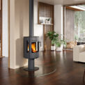 Do you like to watch a blazing fire sometimes from your sofa, sometimes from a window seat or from the dining room? SEIDO T 3S can fulfil your wish thanks to its reliable rotating mechanism. In addition, you can easily secure the position of the stove by locking it. This model is mounted on a stable rotating leg that allows you to adjust the direction of the radiated heat according to the actual desire. The side glazing allows the flames to be viewed from different angles, thus enhancing the aesthetic impression. With a choice of different cladding types and colour options, SEIDO T 3S can be easily adapted to your personal preferences and interior design, while its robust construction guarantees long-term satisfaction and safe use.