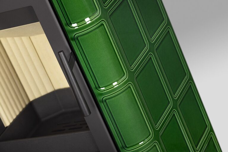 This tiled stove is also suitable for low-energy homes. Thanks to the external air intake (EAI) to the combustion chamber, no interior air is consumed. The design of the stove allows optional flue connection both ways, top or rear. The door glass is washed on the inside with the secondary air intake and thus prevents the cumulation of soot. The combustion chamber is lined with chamotte brick tiles. The regulation of the primary and secondary air intake is controlled by a single control element.