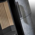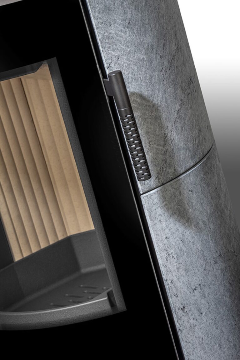 The SORIA N fireplace stoves are equipped with a new system for closing the door which enables a user-friendly door self-closing. The burning process in brand new chamber is optimized to achieve the best efficiency. The large door glazing includes a design print. The stove can be fitted with special accumulation tiles in the space above the combustion chamber. This “mass” of accumulation elements can extend the heat radiation period of the stove by up to 5,5 hours. The combustion chamber is equipped with a heavy cast iron grate and heat-resistant chamotte brick tiles. This fireplace stove is suitable for low-energy homes. The standard version includes the option to connect an upper or rear flue gas exhaust. An EAI (External Air Intake) system is included. Thanks to the secondary air intake, the door glass is air-washed to prevent the cumulation of soot. The primary and secondary air intakes are regulated by a single control element.