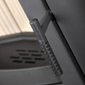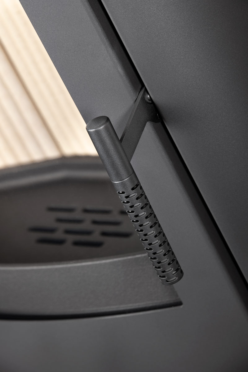 An EAI (External Air Intake) system is included. The standard version includes the option to connect an upper or rear flue gas exhaust. Thanks to the secondary air intake, the door glass is air-washed to prevent the cumulation of soot. The combustion chamber is lined with chamotte brick tiles. The primary and secondary air intakes are regulated by a single control element.