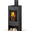This fireplace stove is suitable for all types of interiors. The design of the stove allows optional flue connection both ways, top or rear. Thanks to the secondary air intake, the door glass is air-washed to prevent the cumulation of soot. The combustion chamber is lined with chamotte brick tiles. The primary and secondary air intakes are regulated by a single control element. The bottom part of the stove can be used for storing a small amount of wood.