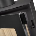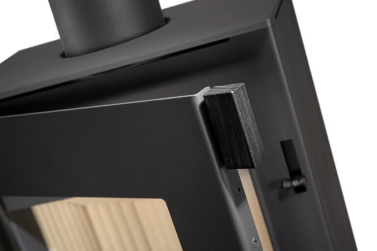The stove is equipped with a self-locking mechanism of open door, which makes it easy to operate and reload. You can rely on the two-point closing mechanism with fixed fixation to the body. The solid wood door handle perfectly complements the overall design of the stove. The customer can choose from two standard flue outlets – top or rear. The glass of the door on the inside washes the secondary air flowing in, which prevents the build-up of dirt. The stove has a EAI system – external air inlet so they are also suitable for low-energy houses.