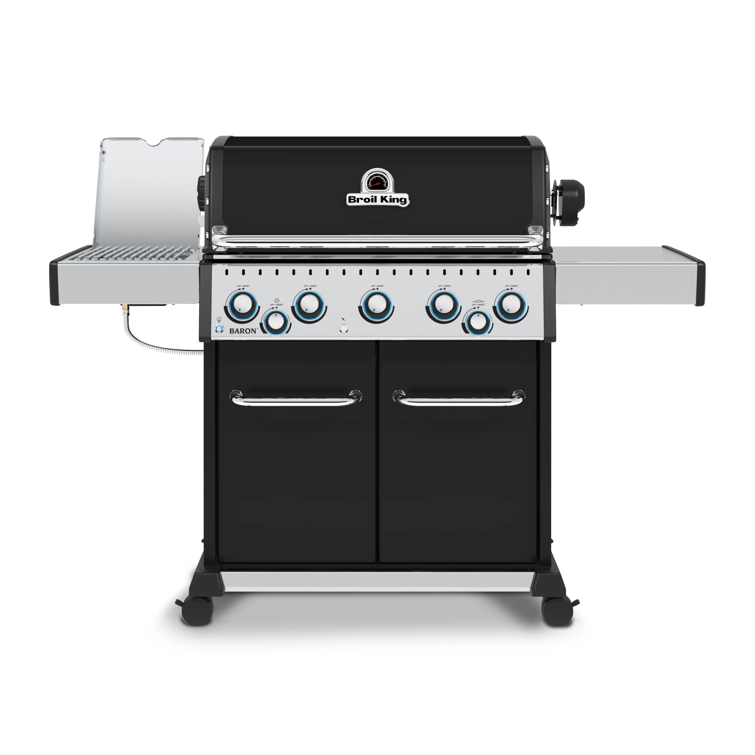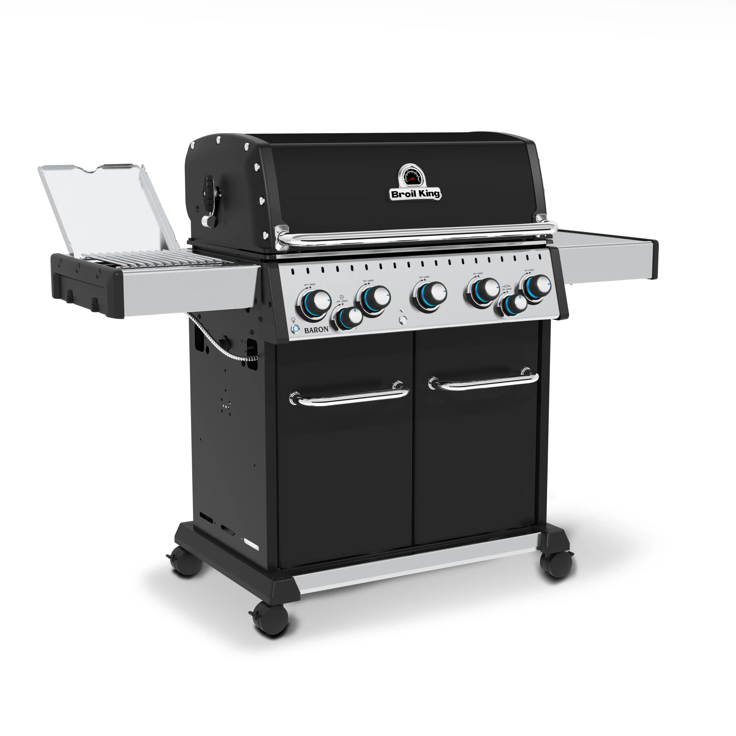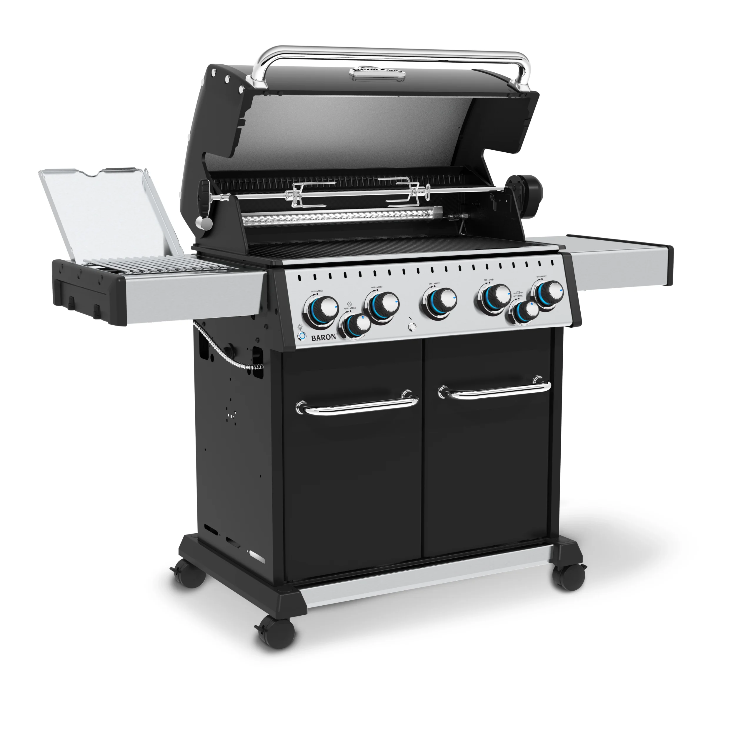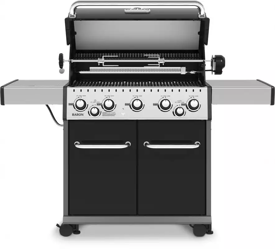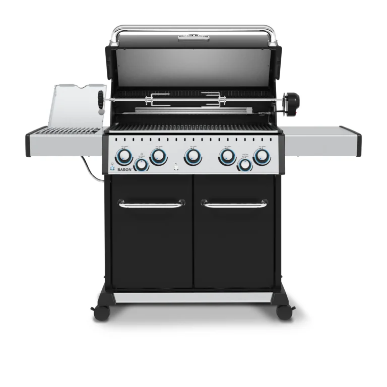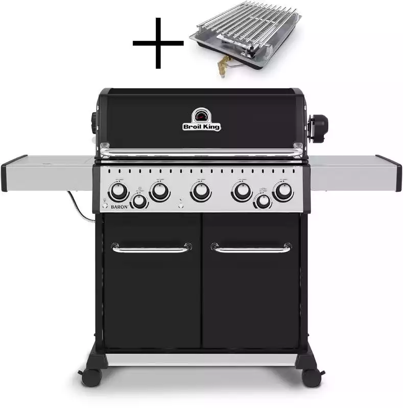 Broil King Baron S 590 IR je vrhunski plinski žar, ki združuje moč, vsestranskost in moderen dizajn. Zasnovan za zahtevne uporabnike, ki želijo od klasične peke do gurmanskih specialitet, ta model ponuja vse – od popolnega zrezka z infrardečega stranskega gorilnika do počasi pečenih jedi na vrhunskem ražnju.
